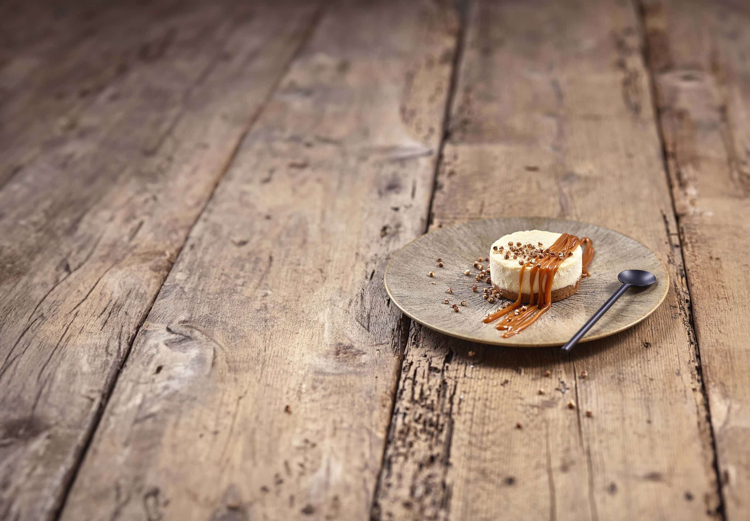 Traiteur de Paris Food Service > Inspiration recettes > Recettes de nos Chefs > Dressage : Cheesecake caramel de sarrasin torréfié