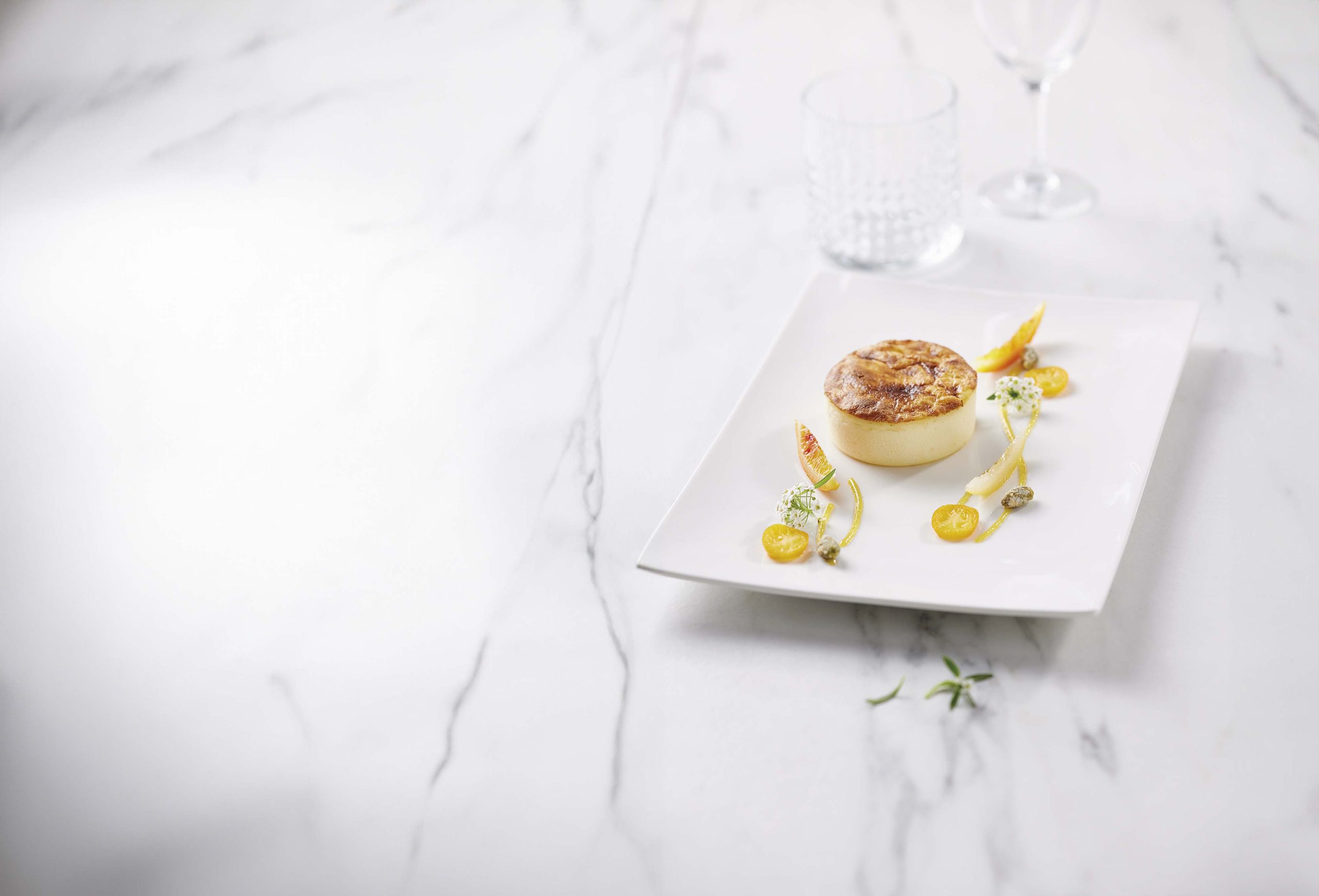 Traiteur de Paris Food Service > Inspiration recettes > Recettes de nos Chefs > Dressage : Cheesecake Saint-Sébastien agrumes mi-confits et fleur d’oranger