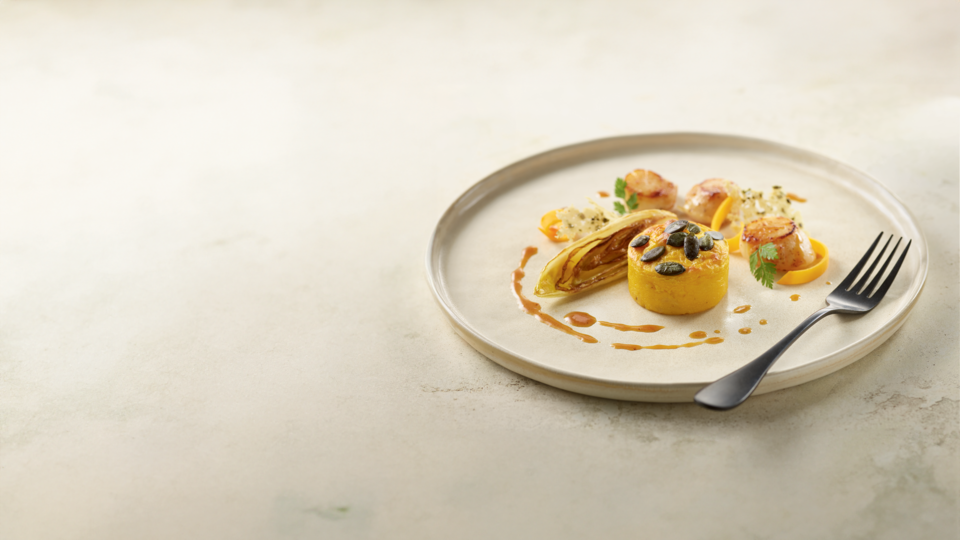 Traiteur de Paris Food Service > Inspiration recettes > Recettes de nos Chefs > Dressage : Mousseline de Butternut, Saint-Jacques snackées et endives braisées