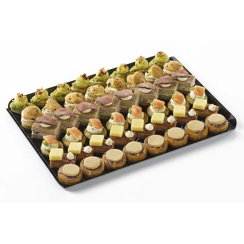 Le Plateau Traiteur de Paris d’Amuse-Bouches Prestige se compose de 48 pièces généreusement garnies d’ingrédients nobles : foie gras, saumon, crevette, magret fumé ou encore Comté. Ces bouchées gourmandes séduiront les convives par leurs garnitures colorées, minutieusement disposées à la main sur des bases originales.