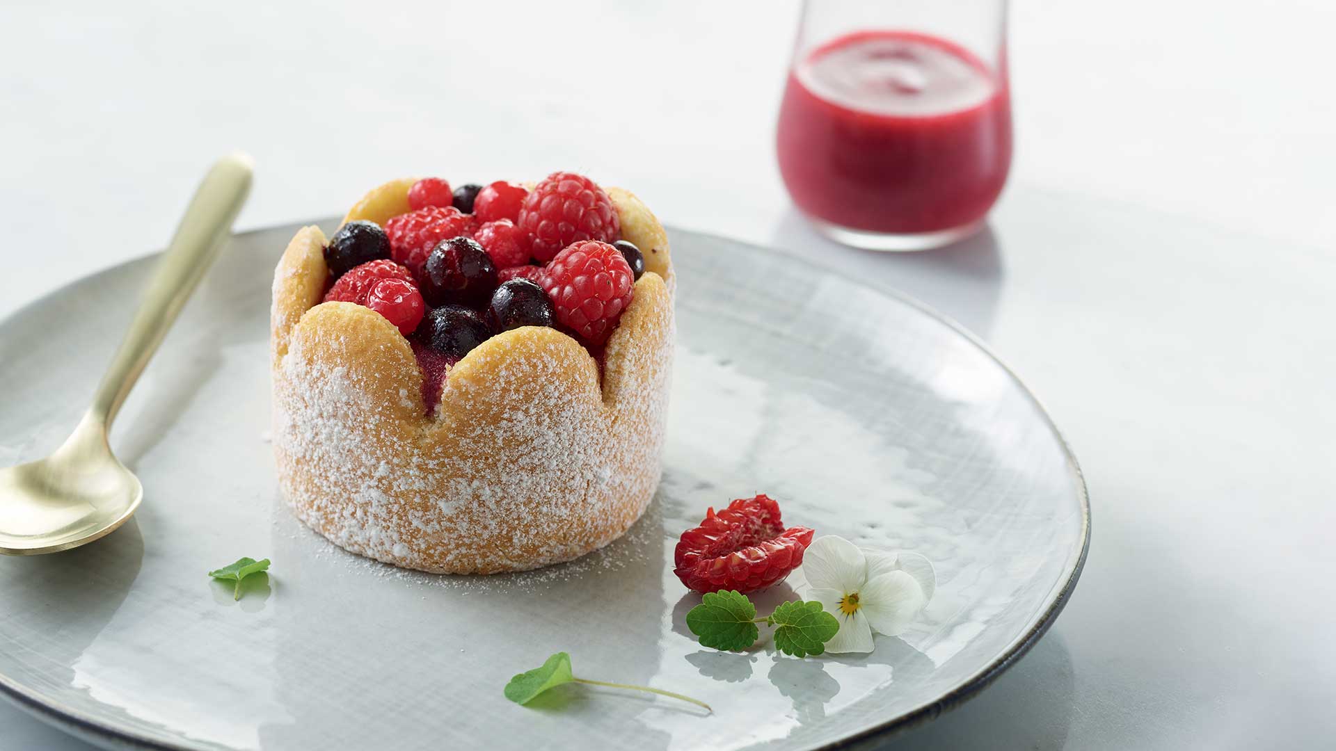 Ce dessert se compose d’une génoise gourmande aux pépites de framboises, d’une mousse parfumée à la vanille et d’une gelée de fruits rouges. La touche finale est apportée par un décor de fruits rouges entiers (framboises, mûres, groseilles et cassis).