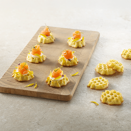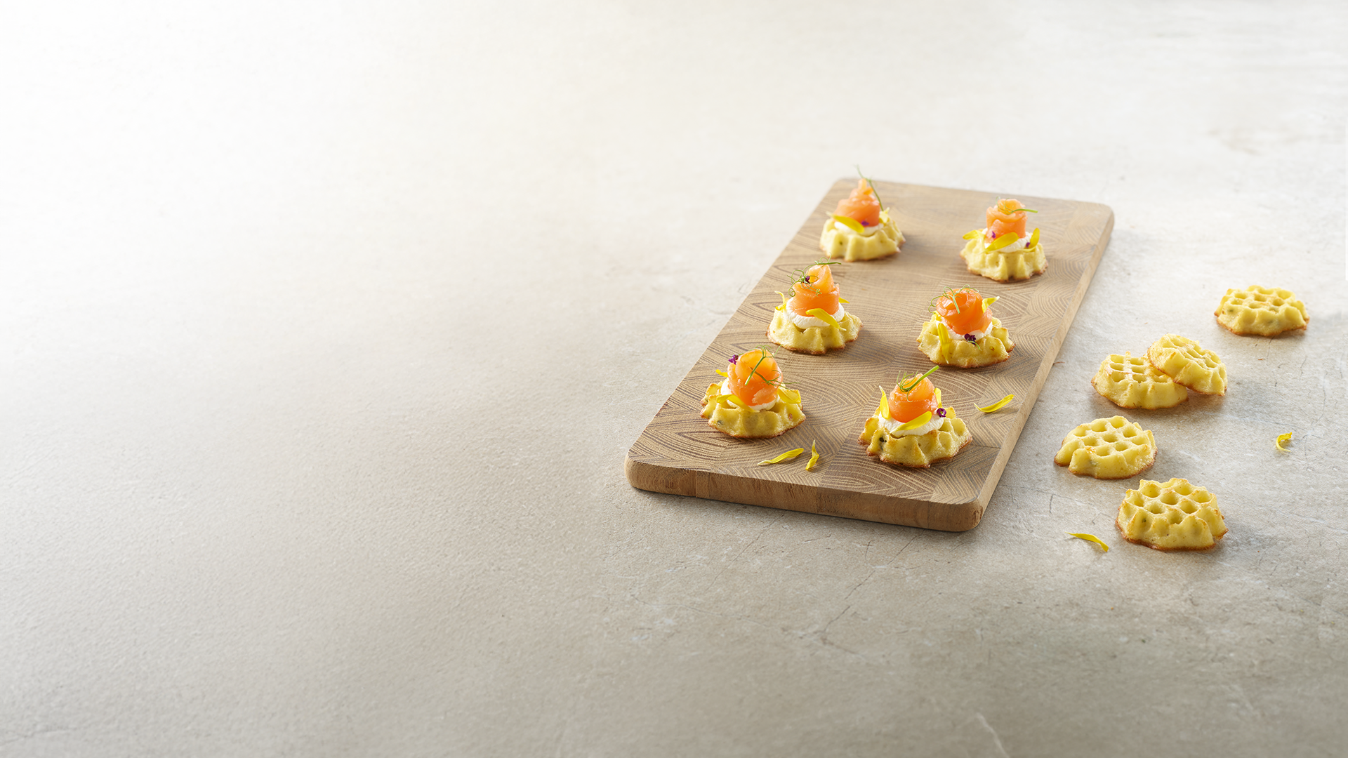 Avec son goût consensuel et sa générosité, la Mini-Gaufre de Pommes de Terre s’impose comme une base incontournable pour des créations salées faciles à intégrer, en proposition froide ou chaude, à vos buffets.